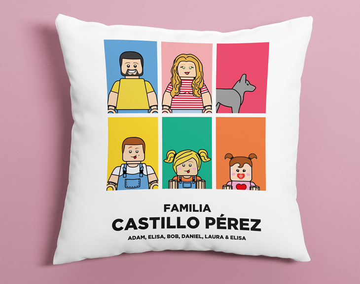 ¿Qué te parecería vestir vuestra casa con un estilo moderno y colorido que de muchísima vida a vuestro hogar? Hazle un regalo de lo más exclusivo a toda la familia con un cojín personalizado tan chulo como este. ¡Será la mejor forma de echarse una siesta en el sofá y decorar el salón de una forma completamente novedosa! Y es que este cojín con diseño de collage Lego estilo Pop es ideal si tu familia se caracteriza por ser de lo más animada y artística. Contará con la funda, de 40x40 centímetros y en la que estará impreso este diseño pop; y con el relleno, también cuadrado y de lo más mullidito para estar abrazado al cojín todo el tiempo posible. ¡Es el mejor detalle para los fans de los sets de construcción! El color está muy de moda, y este regalo original os vendrá perfectamente bien para hacerle una sorpresa a tus seres queridos, ya sea tu familia o tu grupo de amigos. ¿Cómo podrás personalizar este cojín? En el interior del área de personalización podrás escoger hasta 6 personajes Lego entre los disponibles o incluso podrás diseñar tus propias figuras. ¡Solo tendrás que entrar en el área de personalización y y añadirle diferentes características y vestimentas a cada personaje! En el interior del diseñador encontrarás también los diferentes tipos de collages Pop con los que contamos, dependiendo del número de personajes escogido. Tendrás que clicar sobre el diseño que se ajuste al número de personajes. Por ejemplo, si escoges un total de 5 personajes para tu producto, tendrás que escoger el diseño titulado "5 personajes". Una vez escogido, podrás escribir el texto que quieras para tu diseño collage. ¡Podrás escribir desde los nombres de todos los miembros de la familia hasta una bonita dedicatoria! Medidas: 40 x 40 centímetros.