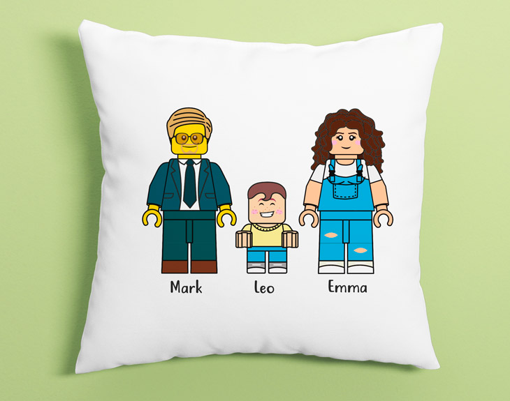 Si has crecido con una familia Lego en tu habitación y has inventado millones de historias mientras jugabas con ellos, este cojín personalizado se te hará muy familiar. Pero es que si conoces a alguien que esté más loco por los Legos que tú, este es un regalazo que le va a sorprender. Personaliza el cojín con nuestra familia Lego, unos 100 personajes diferentes te están esperando para ser elegidos. Tienes distintos hombres, mujeres, niños, niñas e, incluso, mascotas para escribirles el nombre debajo y crear tu propia familia. Elige el color del fondo. Importante: a partir de 6 personajes irán distribuidos en dos filas. Es decir: - Familia de 6 personajes: 3 en la fila superior, y 3 en la inferior. - Familia de 7 personajes: 4 en la fila superior, y 3 en la inferior. - Familia de 8 personajes: 4 en la fila superior, y 4 en la inferior.