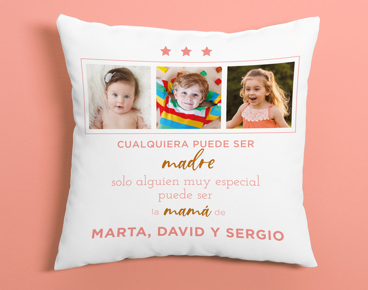 Si para ti tu madre es la persona más especial del mundo, no hay mejor forma de recordárselo que con este cojín personalizado. Dicen que cualquiera puede ser madre, pero seguro que no cualquiera puede ser la madre más especial del mundo. ¡Porque madre solo hay una! Estamos seguro de que con este cojín y su mensaje le quedará claro que para ti es la más especial del mundo. Si tu madre es de esas personas que siempre están haciendo algo y no paran en todo el día, este original cojín es el regalo perfecto para que pueda descansar siempre que quiera, porque se lo merece. Después de una larga jornada de trabajo, de hacer tareas, ir a la compra, al gimnasio o hacer cualquier actividad, no habrá nada mejor para ella que reposar y descansar sobre este cojín tan especial. ¡Sorpréndela en el Día de la Madre o su cumpleaños con este detalle! Para concluir este regalo, solo tendréis que personalizar este bonito cojín con vuestras fotos favoritas y los nombres de sus personas favoritas: sus hijos. Añade el producto al carrito y entra en el diseñador. Ahí encontrarás la plantilla del producto, a la que solo tendrás que añadirle las imágenes que quieras y los nombres o el texto que prefieras para tu diseño. ¡Clica sobre cada cuadro de texto o foto para personalizarlo y listo!