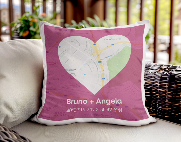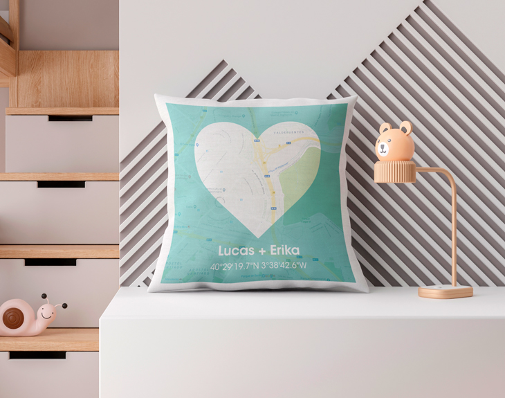 ¿Cada vez que pasas por el lugar en el que empezó vuestra relación se mueven las mariposas del estómago? Si tenéis muy claro dónde empezó todo, el cojín "Mapa del amor" tiene que entrar en vuestra vida. Al adquirir el producto (y antes de pagar) se te preguntarán los nombres y la dirección para el mapa.