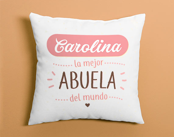 El cojín personalizado que le dará un toque de alegría al salón de tu abuela. ¿Quieres hacerle sonreír y no se te ocurre cómo? Este regalo original lo hará por ti. Personaliza el cojín con el nombre de tu abuela y demuéstrale que le quieres muchísimo. Te lo va a agradecer tanto que es probable que hasta se emocione. ¡Hazle feliz a tu abuela con detalles pequeños! Antes de pagar, te preguntaremos su nombre para personalizar al máximo el producto.