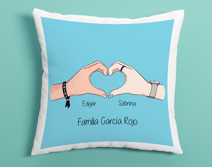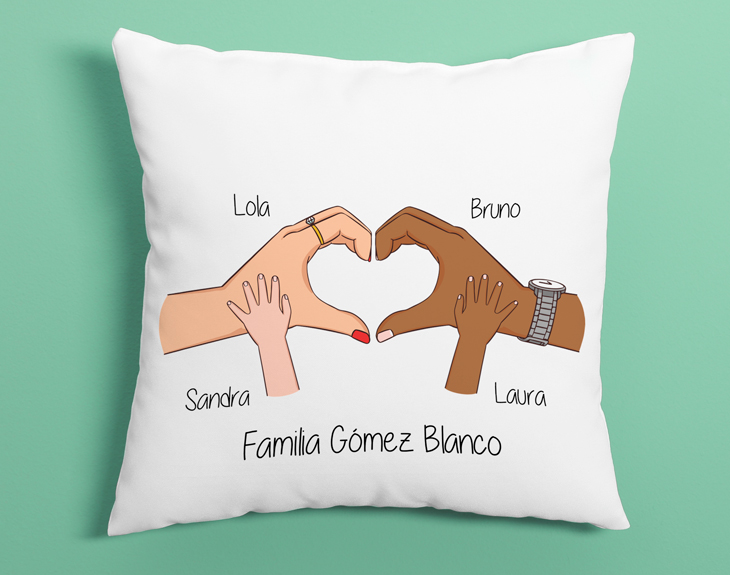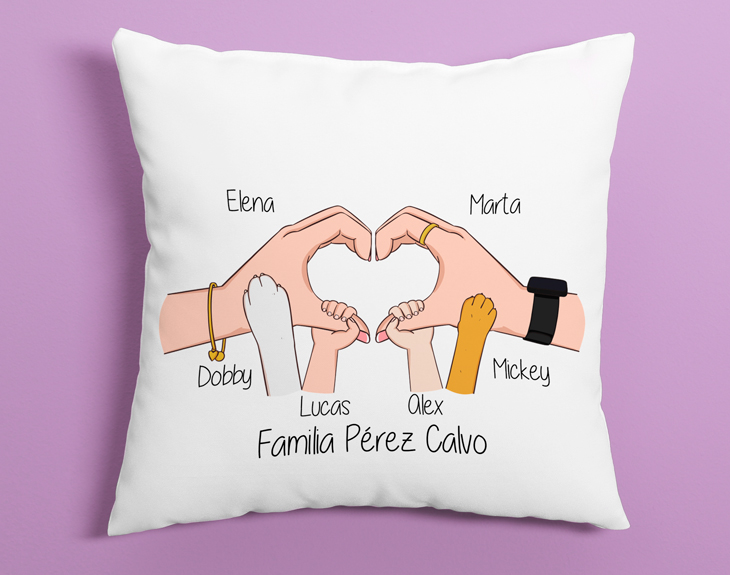 No importa cómo sea tu familia o cuántos miembros tenga, seguro que para ti es la mejor del mundo. Si todos estáis muy unidos, os apoyáis siempre y sois lo más importante los unos para los otros, sorprende a tu familia con este cojín personalizado. Será el regalo más bonito que hayan recibido en mucho tiempo, porque con este bonito diseño, podrás representar a tu familia: papás, mamás, hermanos y hasta mascotas, que son uno más en la familia. Si te apetece tener un detalle con las personas más importantes de tu vida, sorpréndeles con este original cojín en cualquier ocasión. Es el regalo perfecto para un cumpleaños, un amigo invisible o el Día del Padre o de la Madre. Con este cojín, súper cómodo y suave, cualquier persona podrá descansar sobre él después de un día duro y cada vez que lo vea se acordará de la familia que tiene y lo mucho que la quiere. Para personalizar este cojín sólo tendrás que añadir el producto al carrito y comenzar a crear tu propia familia. Ahí, podrás acceder al apartado donde tendrás todo lo necesario para crear tus propias manos con todo los detalles necesarios. ¡Ponte manos a la obra y crea tu diseño desde cero! Una vez acabes, podrás finalizar tu compra y disfrutar de esta taza tan guay. Pero si este diseño te ha gustado, podrás elegir la opción del pack que incluye cojín y taza personalizados. Podrás personalizar ambos productos para hacer un regalo único. Porque si es guay llevarse solo un producto, imagínate poder llevarte dos. ¡Es genial! Importante: Podrás crear el diseño desde cero, eligiendo todos los detalles necesarios (color de la piel, accesorios para las manos, mezclar manos con patitas de gato o perro, pintar las uñas)