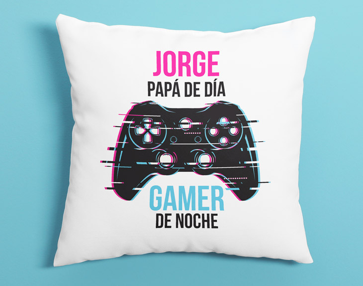 ¿De entre todas las facetas de tu padre tu favorita es la de gamer?¡Entonces este cojín personalizado es el regalo perfecto para dejarle sin palabras en cualquier ocasión especial como su cumpleaños, el Día del Padre o Navidad. ¡Le encantará! Solamente tienes que decirnos su nombre y nosotros nos encargaremos del resto. Imagínate lo guay que será tumbarse en el sofá con este cojín y disfrutar de las mejores partidas de sus juegos favoritos. Además, si te ha pegado su afición por los juegos y os encanta pasar horas y horas jugando juntos, este regalo tiene su nombre. ¡Se emocionará muchísimo al verlo!