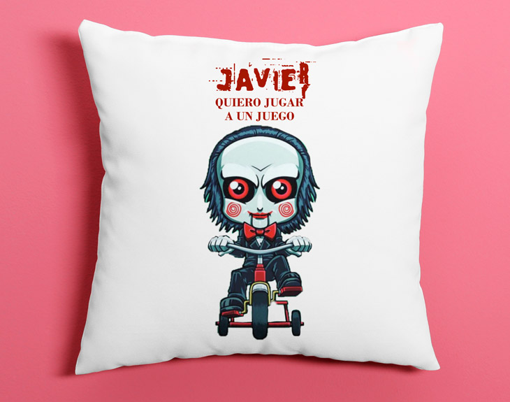 ¿Eres de los que no pueden dormir cuando ven una película de miedo? ¿O te encanta el terror y no puedes dejar de pensar en los monstruos y su trasfondo? 'Saw' es una de esas películas que te dejan pensando y puede que, también, te quite el sueño. Para que lo recuperes de la manera más cómoda y reflexiones sobre su mensaje, no te puedes perder este cojín personalizado basado en la saga de cine. ¡Incluye una de las frases más famosas de las películas! Para que veas cómodamente las ocho entregas de la franquicia o cualquier otro filme de terror y gore, hemos pegado este diseño sobre un cojín acolchado de 40x40 centímetros (relleno incluido). Pero también, es un gran regalo original de Halloween para cualquier persona que le encanten los muñequitos monos. ¡Preséntale a Billy y su icónico triciclo con el que saluda a todas las victimas de John Kramer! Si quieres sentirte como una de ellas, puedes personalizar la funda del cojín con tu nombre para que el muñeco de Saw te diga la frase con la que empiezan todas las trampas: ¡quiero jugar a un juego! Importante: si eliges la opción que incluye taza, esta será de cerámica.
