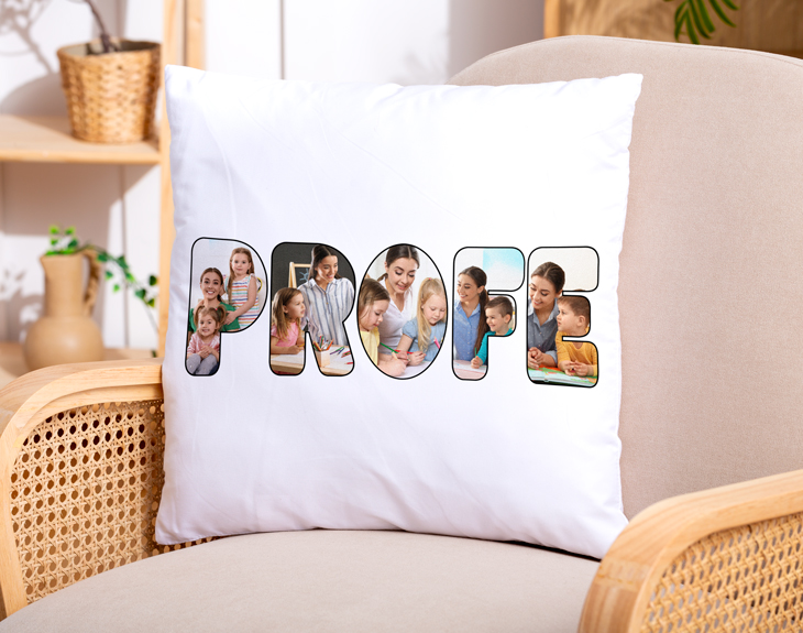 Profe: cinco letras que significan mucho. Pon una foto en cada una de ellas y haz que este cojín personalizado se convierta en el regalo más especial del mundo. El regalo es perfecto para sorprender a tu profe a final del curso, para celebrar su cumple o simplemente para agradecerle sus enseñanzas.