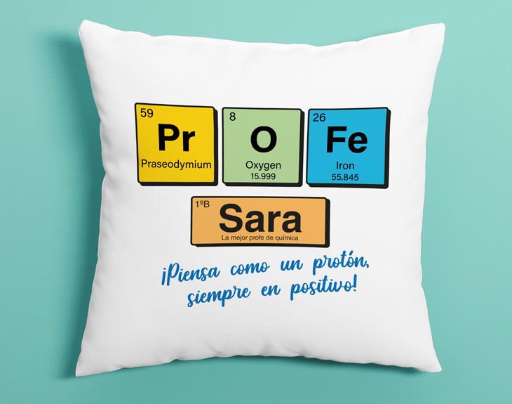 ¿Eras más de física o de química en el colegio? Todos tenemos una asignatura que nos salvaba los días de clase. Para algunos era matemáticas o cualquier otra asignatura de ciencias, de esas que tenías que estudiar y estudiar hasta aprenderte las multiplicaciones o las divisiones. Mientras tanto, otros preferían lengua, historia o cualquier asignatura que estuviese más relacionada con las artes o las humanidades. Seguro que tuviste un profesor excepcional que hizo que te enamoraras de una asignatura en concreto. Ese profe de música que siempre estaba dispuesto a ayudarte, o esa profe de inglés que no paró hasta que se te quedó en la memoria el verbo "to be". ¿Tus hijos tienen un maestro tan bueno y enrollado como ellos? ¡Es el momento de que le recompenses por su esfuerzo! El cojín personalizado "Tabla periódica" le dejará claro la química que tiene. Este diseño tan singular sorprenderá al mejor profesor del mundo. Los símbolos de la tabla periódica formarán la palabra PROFE, haciendo que el producto resulte de lo más novedoso y peculiar. ¿Quieres que sea aún más personal? Podrás personalizar este regalo original para profes con el nombre del maestro. Gracias a este cojín, el mejor profesor podrá descansar de la mejor manera posible.