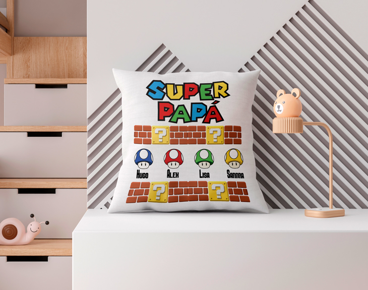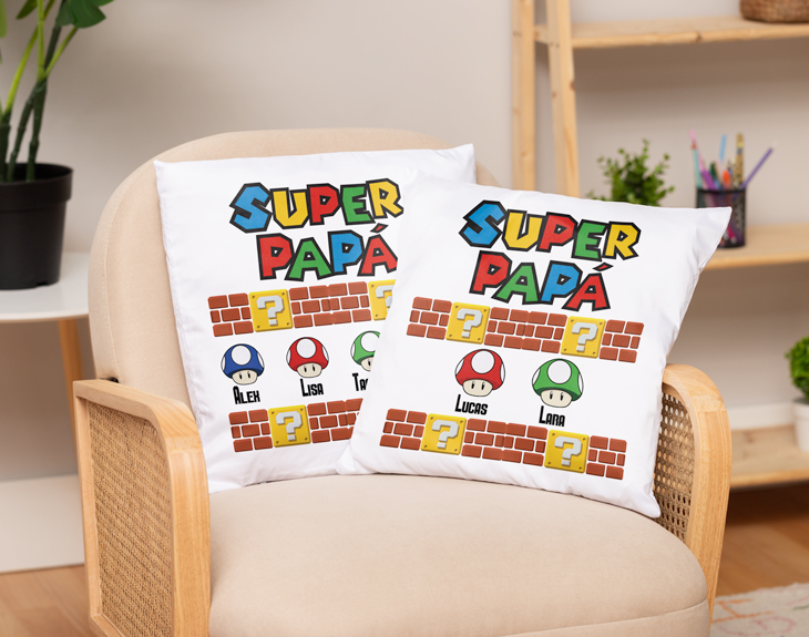 Ser padre no es tarea fácil. Si para ti, tu padre es el mejor del mundo y estás muy agradecido por todo lo que hace por vosotros, está claro que tienes que demostrárselo de alguna manera, y... ¿qué mejor forma que regalándole nuestro cojín personalizado con diseño "Superpapá Mario Bros"? ¡Le encantará! Ya sea por su cumpleaños, por el Día del Padre o simplemente por ser el mejor padre del mundo, este cojín es ideal para sorprenderle en estas fechas tan especiales. Lo mejor de este cojín es que es personalizable. Podrás escribir el nombre que tú quieras. Sin duda, se convertirá en un especial regalo para esos padres fans de Mario Bros. Por último, para personalizar este cojín es súper sencillo. El primer paso a seguir consiste en añadir el producto al carrito y entrar al área de personalización. Una vez ahí, ya puedes crear a estos avatares como tu quieras. Pronto estará perfecto y lista para regalar. ¡Será el regalo perfecto para fans de Mario Bros! Además, también podrás escoger la opción de añadir una taza personalizada para hacer el pack completo. Así es mucho mejor empezar el día porque tendrás toda la energía del mundo. ¡No te quedes sin este súper pack!