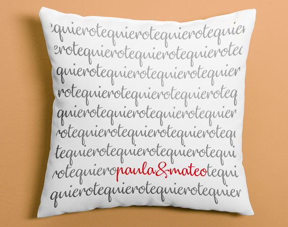 Imagínate un cojín blandito como él solo, en el que pone "te quiero" por casi todas partes. ¿Casi? Exacto, porque en un rinconcito pondremos vuestros nombres. Personaliza este cojín y haz un regalo muy romántico en San Valentín, vuestro aniversario o cualquier otra fecha especial.