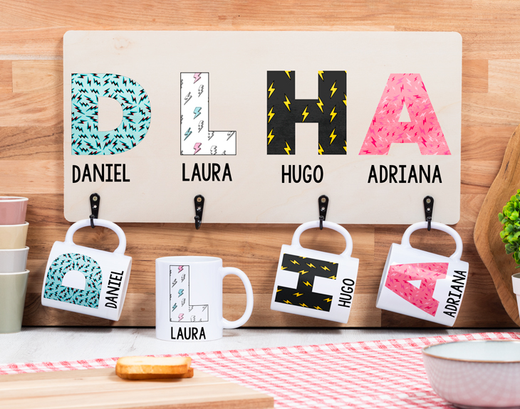 ¿A quién no le gusta disfrutar de un café por la mañana? Despertarse, ir a la cocina y prepararte una taza de esta bebida tan rica, no tiene precio. Si tú también eres de esas personas que tiene un rinconcito para el café, no podrá faltarte tu propio colgador para tazas de madera personalizado. El adorno perfecto para ponerlo en la cocina o donde tú quieras y con el que podrás tener tus tazas favoritas organizadas y siempre a mano para ese café mañanero. ¡Es ideal! Este original adorno de madera es el regalo perfecto para cualquier amante del café porque además de ser bonito es súper práctico. Cuenta con cuatro colgadores de color negro en los que podrás poner esas tazas que tanto te gustan siempre a la vista. Pero espera porque hay más, podrás elegir si quieres comprar únicamente el colgador o incluir cuatro tazas personalizadas con el mismo diseño. ¡Es un regalazo para fechas especiales! Pero antes de terminar, no te olvides de personalizar este colgador a tu gusto. Elige la opción que quieras y añade el producto al carrito. Podrás elegir las iniciales con tu estampado favorito de nuestra adorable familia "Alfabeto Rayitos" y escribir el nombre para cada una. Si eliges la opción que incluye las tazas, se personalizarán con el mismo diseño, poniendo cada inicial en cada una de las tazas. ¡Así todo irá a conjunto! Ya solo queda colocarlo y disfrutar de este precioso adorno. Medidas: 49,5 x 24 centímetros. Material: madera.