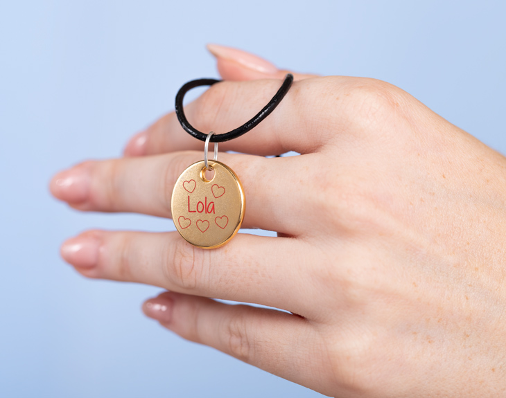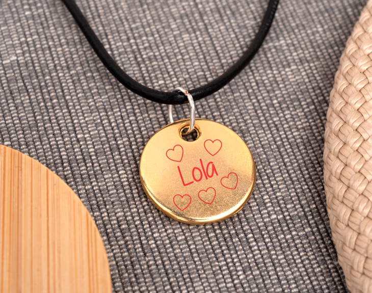 • Colgante de zamak dorado personalizado (22 mm). • Cadena de metal o cordón de cuero negro. • Tarjeta Recordatoria.