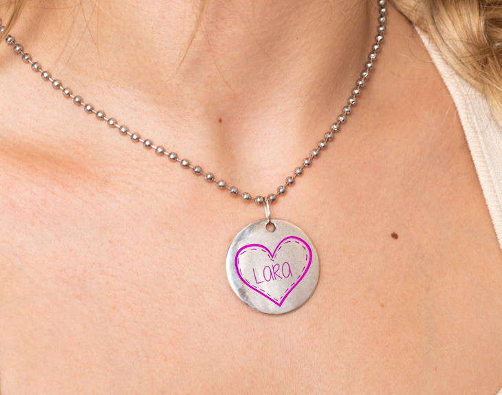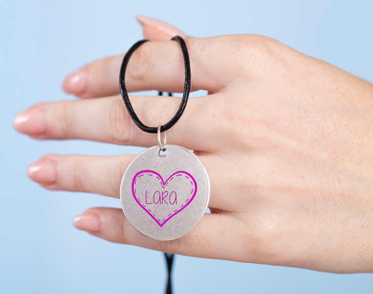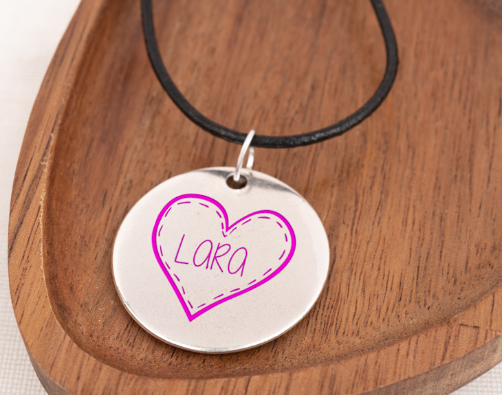 Este colgante personalizado forma parte de nuestra divertida gama Colours, en la que no solo podrás customizar un colgante con el texto y el diseño que quieras, sino también elegir el color con el que se hace el grabado. En este caso en concreto, es un diseño con forma de corazón. Perfecto para sorprender a esa persona especial en su aniversario, en un cumpleaños o en cualquier otra ocasión digna de mención. Como no podía ser de otro modo, dentro del corazón podrás grabar el nombre que quieras.