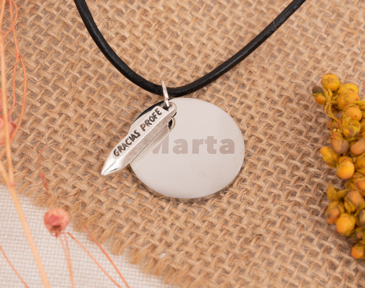 ¡El colgante perfecto para sorprender a tu profe! Una pieza de bisutería formada por un lápiz, una plaquita personalizada y un cordón de cuero. Si tu profesor o profesora se lo ha currado este año y la clase quiere tener un detalle, este colgante personalizado es justo lo que necesitáis. Importante: el llaverito metálico puede variar en función de stock entre un lápiz, cuaderno, calculadora, autobús y regla.