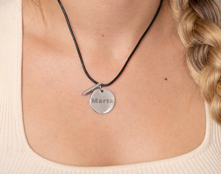 • Colgante personalizado. • Cordón de cuero. • Tarjeta Recordatoria.