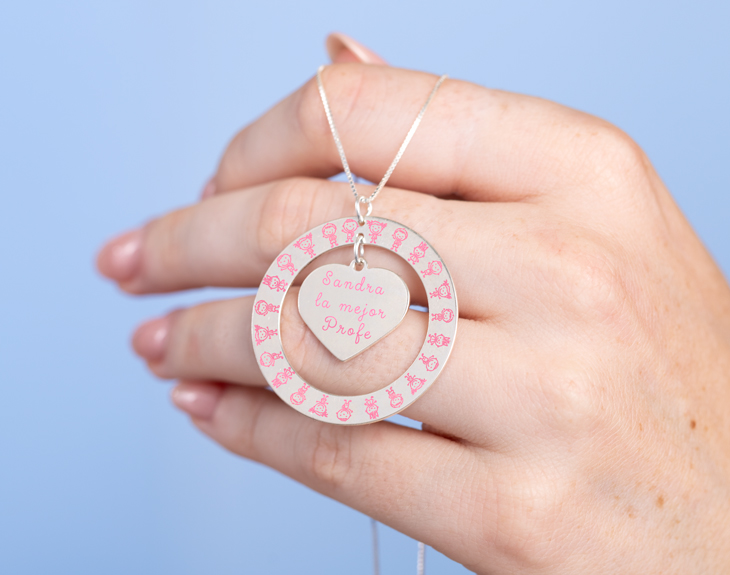 Un colgante de acero grabado con los nombres de los alumnos de la seño más guapa del mundo. Es un regalo original creado para que los alumnos le agradezcan a su profesora favorita todo lo que les ha enseñado. Si tu clase quiere hacerle un regalo molón a la profe, este colgante personalizado puede ser una idea brillante. Al pagar, os preguntaremos por el nombre de la seño, y también por todos los nombres de los alumnos. Así podremos grabar el colgante y personalizarlo al máximo.