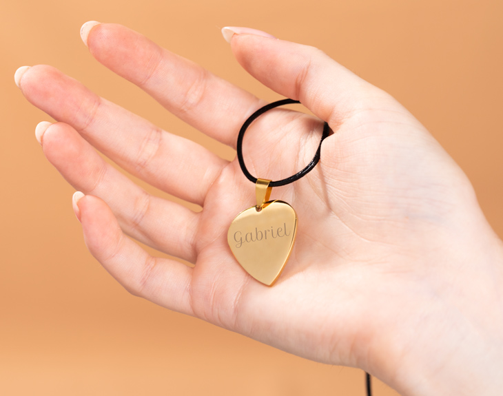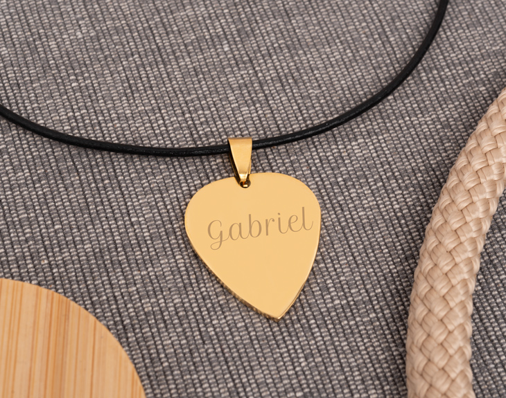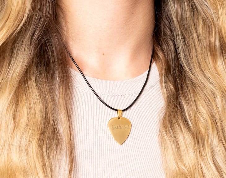 Un regalo perfecto para personas rockeras con mucho glamour. Hablamos de este estupendo colgante con forma de púa, diseñado en tonalidades dorada. Se personaliza con el texto que tú quieras. ¿Tu grupo favorito? ¿El nombre del ser amado? ¿Una fecha especial? Todo es posible en este regalo.