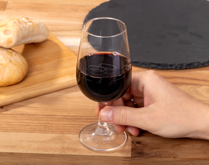 • Copa catavinos grabada (22cl de capacidad). • Tarjeta recordatoria.