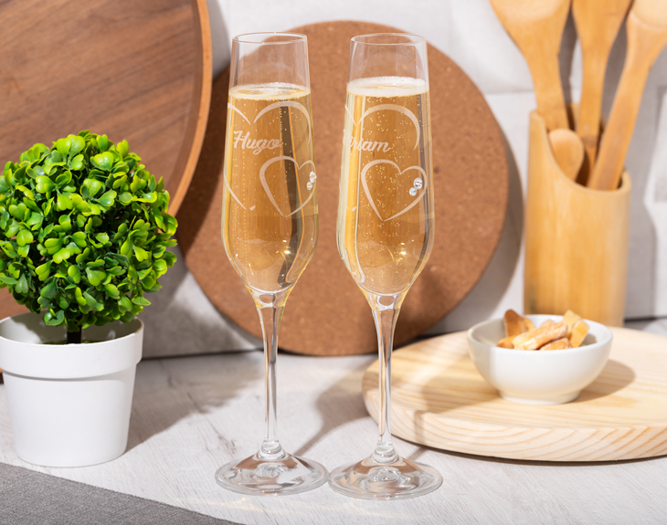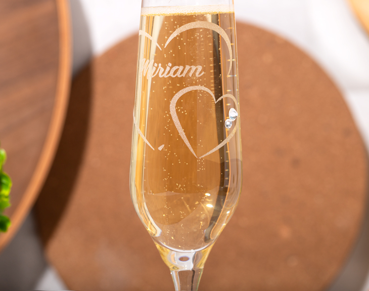 Si el amor ya ha llamado a tu puerta, está claro que es un gran motivo de celebración. Encontrar a una persona que sea compatible contigo no es tarea fácil. Por eso, si se acerca alguna fecha importante como San Valentín, vuestro aniversario o un cumpleaños, nuestras copas de cava con Swarovski® es algo que no puede faltar en la celebración. Gracias a esas copas podréis brindar por vuestro amor y por lo mucho que os queréis. Son ideales para sorprender a tu pareja con una cenita romántica y con un brindis de cava para celebrar. Imagina la ilusión que le hará ver vuestros nombres grabados en estas copas tan elegantes, sin duda, le encantarán. Personalizar estas copas de cava es súper sencillo. El primer paso a seguir consiste en añadir el producto al carrito y entrar al área de personalización. Una vez ahí, ya puedes escribir vuestros nombres y nosotros nos encargamos de todo lo demás. Pronto estarán perfectas y listas para regalar. ¡Será un original regalo para enamorados! Cómo cuidar tus copas: para mantener la belleza de tus copas por favor sigue las instrucciones con cuidado. Es importante evitar que sean expuestas a altas temperaturas. Lávalas siempre a mano, con mucho cuidado de no dañar los cristales. Seca con un trapo suave, sujetando la pieza por la parte superior. No aptas para lavavajillas. Capacidad de las copas: 210 ml. Medidas de las copas: 26 cm de alto.