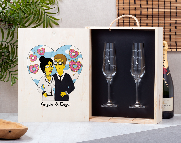 Encontrar a la persona ideal puede resultar un poco difícil. Tiene que tener muchas cualidades, como ser detallista, inteligente, cariñoso/a... Pero, sobre todo, la más importante: ser fan de los Simpson. Si tú ya has encontrado a la persona perfecta con quien hacer un maratón de esta serie tan chula, está claro que es motivo de celebración y... ¿qué mejor que con nuestra caja con copas de cava "Pareja Simpson"? Compartir tu vida con alguien que tiene tus mismos gustos es súper guay. Si ambos adoráis la serie de Los Simpson, está claro que nuestra caja de madera con copas de cava con Swarovski, es algo que no os puede faltar. Lo mejor es la caja personalizable. ¡Tú eres quien crea a esta pareja de Simpson! Puedes elegir entre un montón de rasgos y accesorios diferentes, seguro que consigues que os representes. ¡Seréis la pareja más goals de todo Springfield! En el interior de la caja reposan dos copas de cava con Swarovski, que tienes la opción de grabarla con los nombres que quieras. ¡Son geniales para que podáis brindar por vuestro amor! Personalizar esta caja con copas de cava es súper sencillo. El primer paso a seguir consiste en añadir el producto al carrito y entrar al área de personalización. Una vez ahí, ya puedes crear a los avatares y escribir los nombres que tú quieras. ¡Será un original regalo para parejas! Cómo cuidar tus copas: para mantener la belleza de tus copas por favor sigue las instrucciones con cuidado. Es importante evitar que sean expuestas a altas temperaturas. Lávalas siempre a mano, con mucho cuidado de no dañar los cristales. Seca con un trapo suave, sujetando la pieza por la parte superior. No aptas para lavavajillas. Capacidad de las copas: 210 ml. Medidas de la caja: 37 x 29 x 10 centímetros. Medidas de las copas: 26 cm de alto.