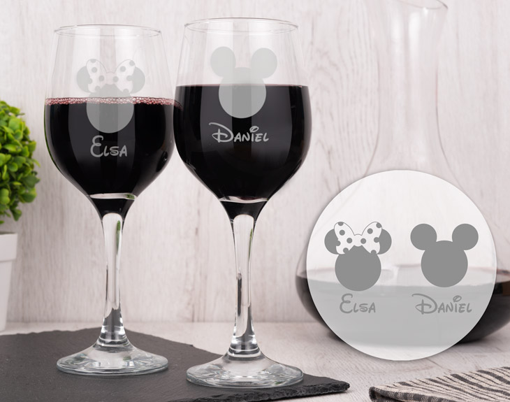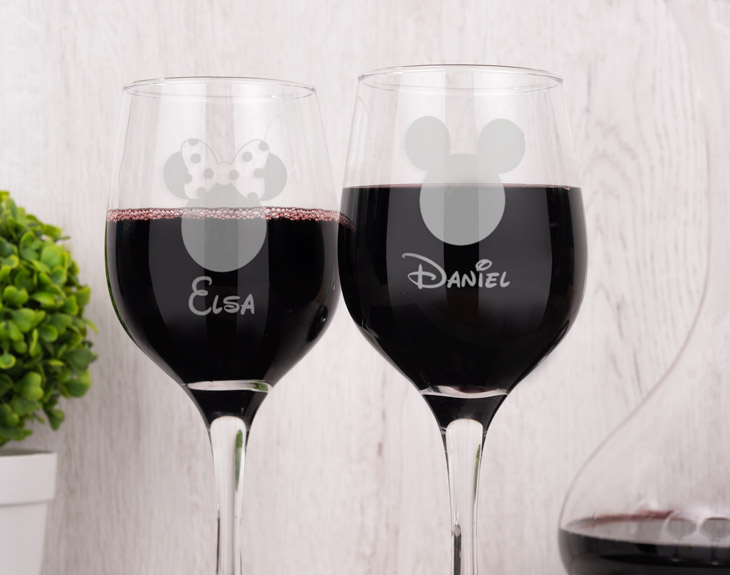 Las mejores parejas del mundo se merecen estas copas de vino grabadas con los personajes más queridos de Disney: Mikey y Minnie. Si vivís todavía en la infancia y no queréis salir de esa fantasía nunca, decirnos vuestros nombres y los grabaremos junto a Mickey y Minnie. Disfruta del amor verdadero con un regalo original perfecto para parejas. Si los mejores años de tu vida están siendo con tu pareja, estas copas de vino están pensadas para vosotros. Sin duda. Eso sí, si tienes una boda no muy lejos de aquí, este regalo es perfecto para sorprender a los protagonistas de la ceremonia. Medidas aproximadas: Diámetro: 6,5cm en la parte superior y 8cm en la parte inferior. Alto: 21cm Capacidad: 372ml