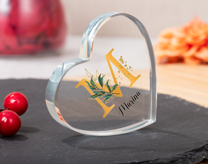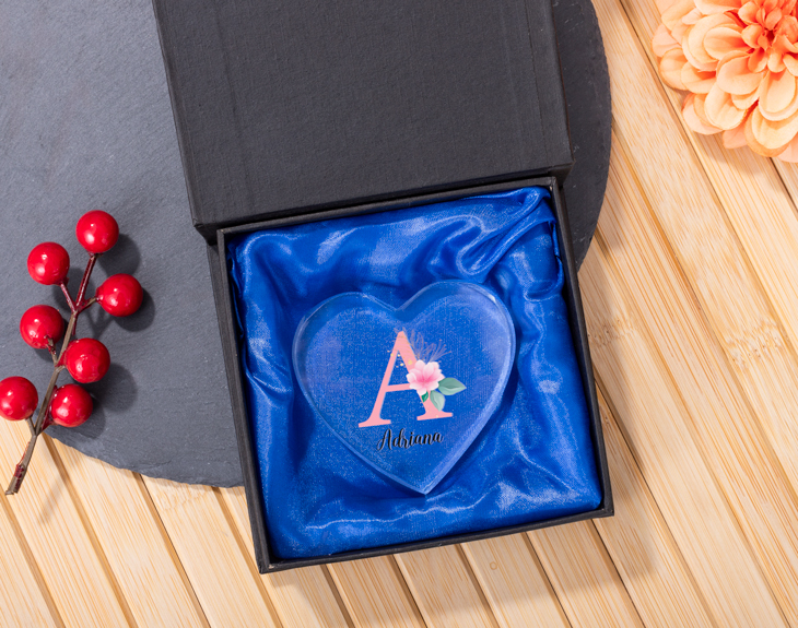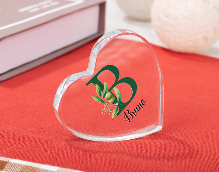 • Corazón personalizado. • Estuche. • Tarjeta Recordatoria. Decorar la casa con gusto es de lo más sencillo con nuestros productos Letras Botánicas, entre los que se encuentra el cristal corazón que os presentamos. Son excelentes para decorar cualquier cuarto de temática clásica y elegante y suelen encajar genial con las personas con gustos refinados y más tradicionales. El cristal en si está tallado en forma de corazón porque creemos que así conseguimos darle un aire más tierno y amoroso. Este producto es transparente y sobre él se imprime la personalización con la letra que escojas. Su ancho de 1 centímetro nos da la posibilidad de exponerlo colocado sobre un lado, aunque también podemos exponerlo con el estuche que trae de base. Para personalizar tu regalo, dispondrás de un catálogo con todas las letras del abecedario. Puedes escoger hasta tres letras si lo deseas, de manera que puedas formar un diseño con las iniciales de ti y de tu pareja o las iniciales del nombre y apellidos del destinatario. Sea como sea, y elijas el diseño que elijas, estamos seguros de que será un regalo espectacular para esa persona tan importante para ti.