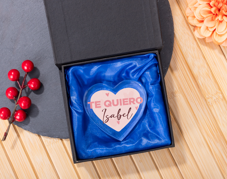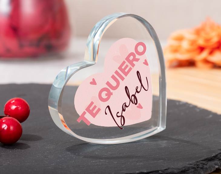 Decir te quiero por primera vez es uno de los momentos más importantes que podemos vivir en una relación. Sientes esas mariposas en el estómago, te sudan las manos, notas la boca seca, y pones tu corazón en las manos de la otra persona por una de las mejores razones del mundo, decirle lo importante que es para ti. ¿Quieres recordarle a tu pareja lo mucho que le quieres? ¿Vas a decir “te quiero” por primera vez? No importa en qué situación te encuentres, siempre que quieras decirle a alguien como te sientes, este corazón de cristal personalizado es el detalle ideal para acompañar tus palabras. Un gran corazón dentro de otro corazón, rodeado de pequeños corazones, un regalo original y romántico que dará un toque muy especial a ese momento tan memorable. Un detalle que perdurará como vuestro amor. Accede a nuestro diseñador e indica el nombre de esa persona tan importante que te pone el corazón feliz. Cristal de 1 cm sólido. - Medida: 7 cm x 7 cm x 1 cm.