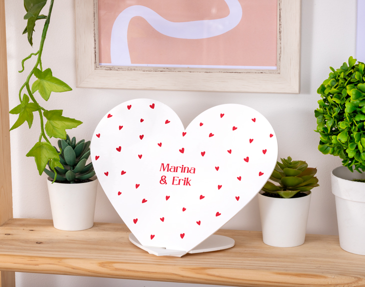 • Corazón de metacrilato personalizado. • Peana de corazón. • Tarjeta Recordatoria.