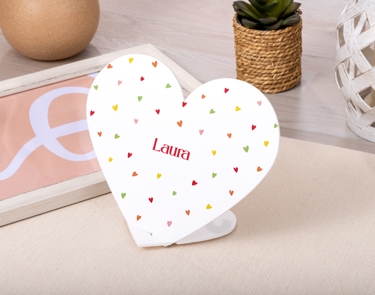 No hay nada como decorar tu nuevo hogar junto a tu pareja. Si quieres sorprenderle con un detalle romántico, nuestro corazón de metacrilato flotante con diseño "Corazoncitos" es justo lo que necesitas. Perfecto si se acerca una fecha especial como vuestro aniversario o el día de San Valentín, no dudes en sorprender a tu pareja con este adorable adorno. Se verá perfecto en cualquier rincón de tu casa, con vuestros nombres o alguna fecha importante para la pareja. ¡Lo mejor de todo es que es personalizable y podrás elegir entre varios colores! Está fabricado en metacrilato blanco y consta de dos piezas en forma de corazón: una más grande, donde se imprimirá el diseño, y otra más pequeña que servirá como base para el corazón central. Al recibirlo, solo tendrás que colocar la base en el corazón y ¡listo! ¡Quedará increíble! Personalizar este adorno es súper sencillo y rápido. El primer paso es añadir el producto al carrito y luego entrar al área de personalización. Allí, podrás escribir los nombres o el texto breve que desees. Pronto recibirás este precioso corazón para sorprender a tu pareja. ¡Le encantará! Tamaño corazón: 20 x 17,5 cm. Tamaño peana corazón: 10 x 8,8 cm.