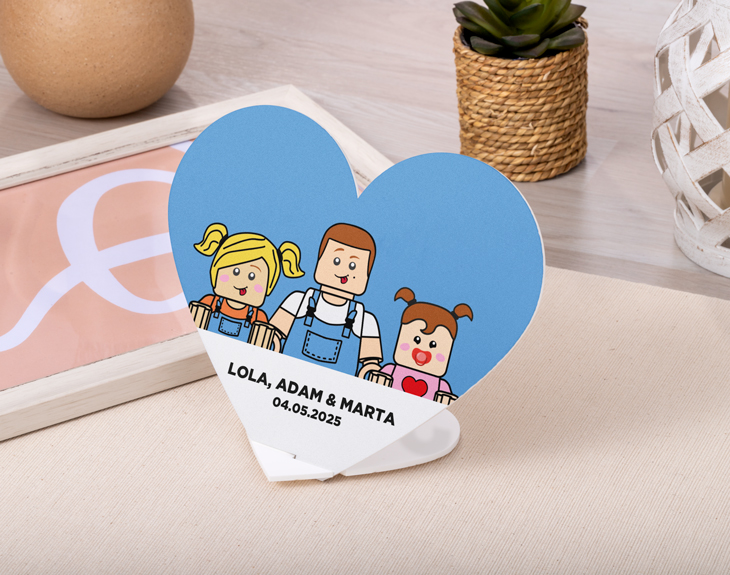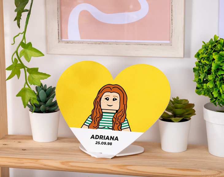 Para que una casa se convierta en un hogar, es necesario que las personas que viven en él aporten ciertos toques especiales como fotografías, recuerdos o cosas que les gusten. Por eso, si quieres llenar de alegría ese rincón que ves un poco vacío, necesitas este precioso corazón personalizado flotante. Este adorno hecho por nosotros quedará perfecto en cualquier lugar de tu casa y además pordrás verte convertido en un muñeco Lego. ¡Es lo más! Si conoces a alguien que se haya mudado recientemente o quieres sorprender a tu pareja, este original adorno para casa es justo lo que necesitas. Está hecho de metacrilato blanco y cuenta con dos piezas en forma de corazón: una más grande, en la que irá el diseño y otra más pequeña que actuará de peana para el corazón central. Al recibir el regalo, solo tienes que colocar la peana en la base de tu corazón y listo. ¡Quedará genial! Y llega el mejor momento que es personalizar este corazón con el diseño que más mola del mundo entero. Si los Lego siempre han formado parte de tu vida, ahora podrás verte como uno de ellos. Entra en nuestro diseñador, elige cuántos personajes quieres y comienza a crearlos desde cero con todos los detalles que quieras. Podrás finalizar con el texto que quieras. Así de fácil. ¡Será el regalo perfecto! Tamaño corazón: 20 x 17,5 cm. Tamaño peana corazón: 10 x 8,8 cm.