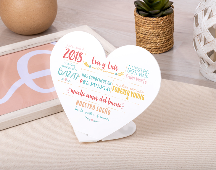 Una relación está llena de momentos especiales, pero algunos son tan únicos que merecen ser inmortalizados. El lugar donde se conocieron, su canción favorita, la fecha de vuestro aniversario, el primer gran viaje... todos esos momentos que quedan grabados en el corazón. Imagina que algo tan bonito decore algún rincón de vuestro hogar. Con nuestro corazón de metacrilato flotante con diseño "Nuestra historia", podrás tener los momentos más importantes de la pareja en un detalle precioso. Un regalo original, perfecto para sorprender a las parejas más románticas. Este corazón quedará genial en cualquier rincón de la casa. Está fabricado en metacrilato blanco y consta de dos piezas en forma de corazón: una más grande, donde se imprimirá el diseño, y otra más pequeña que servirá como base para el corazón central. Al recibirlo, solo tendrás que colocar la base en el corazón y ¡listo! ¡Quedará increíble! Ahora viene el momento más divertido: personalizar este adorno. El primer paso es añadir el producto al carrito y luego entrar al área de personalización. Allí, podrás rellenar los campos de texto que te proponemos en este diseño. ¡Y listo! Pronto recibirás este precioso corazón para sorprender a tu pareja en una fecha especial, como el día de San Valentín. Tamaño corazón: 20 x 17,5 cm. Tamaño peana corazón: 10 x 8,8 cm.