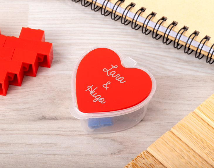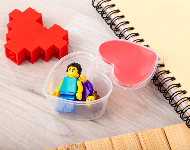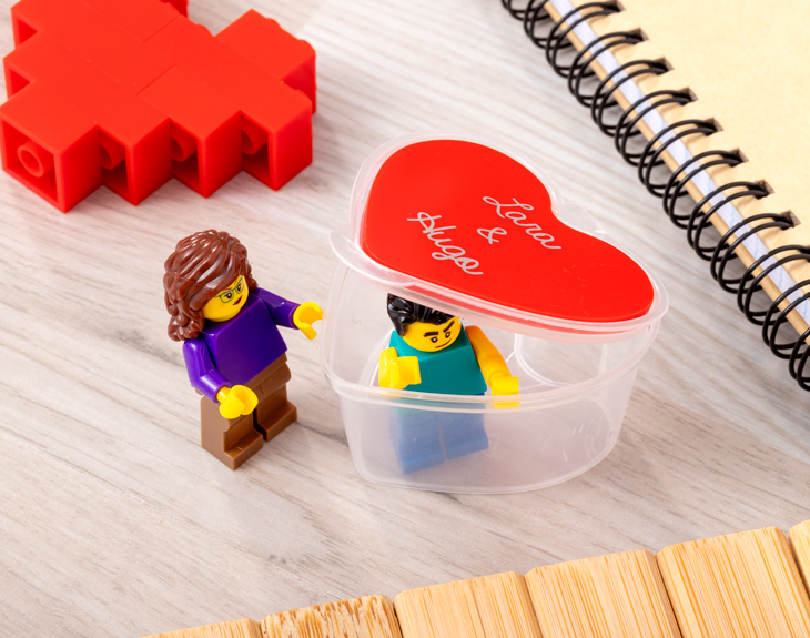 • Pareja Lego Minifigura (dos piezas). • Cajita corazón. • Tarjeta Recordatoria.