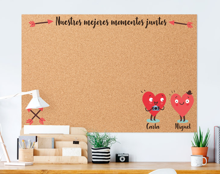 ¡El corcho del amor! Un regalo súper especial para las parejas más románticas y detallistas del mundo. Se trata de un corcho personalizado con el texto que tú quieras y la familia corazones más divertida y amorosa del mundo. Escoge los corazones que quieras de toda la variedad de opciones que te dejamos y ponles nombre a cada corazón. ¡Te quedará un corcho espectacular! Pero no te conformes con eso, porque también podrás elegir el texto superior del corcho. ¿A que no puede ser más romántico? Empieza a personalizar el corcho y después añádele un montón de detalles en casa para sorprender a tu pareja. ¡Alucinará! A partir de 6 personajes irán distribuidos en dos filas, es decir, 3 arriba y 3 abajo. Dimensiones: 91x61 cm. Grosor: 0,45 cm. Importante: Los corchos se entregan sin sistema de colgado , ¡así podrás elegir la forma que más te guste para colocarlos!