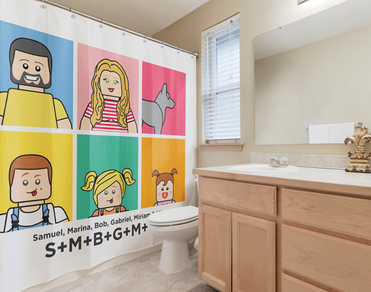 ¿Quieres tener un detalle con ese amigo o familiar que se acaba de mudar? Nosotros tenemos el regalo perfecto. Se trata de nuestra cortina de baño “Lego Pop”, es ideal para decorar el cuarto de baño. ¡Le dará un toque súper personal y original! También es un buen detalle para el amigo invisible, por un cumpleaños o en alguna ocasión especial. Esta cortina de baño tiene la posibilidad de que se puede personalizar, tú diseñas tu propio personaje Lego y nosotros lo plasmamos en la cortina. Puedes crear mínimo un personaje y seis de máximo. ¡Podrás crear un Lego para cada miembro de tu familia! Tienes para elegir entre un montón de rasgos y accesorios, seguro que encuentras los que os representen. Personalizar esta cortina de baño es algo muy sencillo. El primer paso consiste en añadir el producto al carrito y entrar al área de personalización. Una vez ahí, solo queda diseñar a tus avatares desde cero. Todo lo demás es cosa nuestra. ¡Pronto podrás regalar esta cortina de baño tan chula! Información sobre la cortina: - Tamaño: 180 cm x 180 cm. - Material: 100% Poliéster.