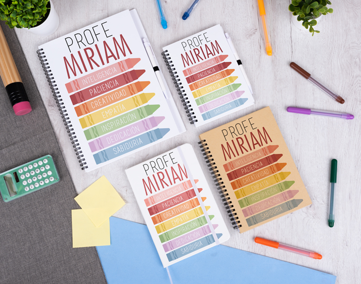 ¡Fin de curso está a la vuelta de la esquina! Y es que un nuevo curso escolar llega a su fin, por lo que es el momento perfecto para tener un detallito con el profe de tus hijos. Sin duda, este cuaderno personalizado es la mejor opción para esta ocasión, porque además de ser un regalo único, también es súper práctico para cualquier maestro. ¡Le encantará! Es hora de poneros todos de acuerdo y triunfar con vuestro profe, maestra o entrenador gracias a este original regalo. Al ser un artículo totalmente personalizable, además de crear el diseño, también podrás elegir el modelo de cuaderno que más te guste: bloc de notas, cuaderno ecológico, cuaderno pequeño o grande con tapa dura. ¡Hay para todos los gustos! Para personalizar este cuaderno, lo único que tienes que hacer es completar este diseño lleno de lápices de colores con el nombre de ese profesor o profesora que tanto os ha enseñado este año. Será la mejor forma de agradecerle toda su dedicación este año. ¡Es un regalo único!