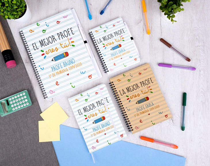 Sorprende a tu profe con el regalo original más práctico de todos. Se trata de un emotivo cuaderno personalizado en el que podrá apuntar todas sus notas. Solamente necesitamos que nos digas su nombre para insertarlo en el diseño y demostrarle que valoráis muchísimo todo lo que os ha enseñado en este curso. Además, podéis aprovechar las primeras páginas para escribirle una dedicatoria de parte de sus alumnos preferidos...¿Os imagináis la cara que pondrá al verlo?