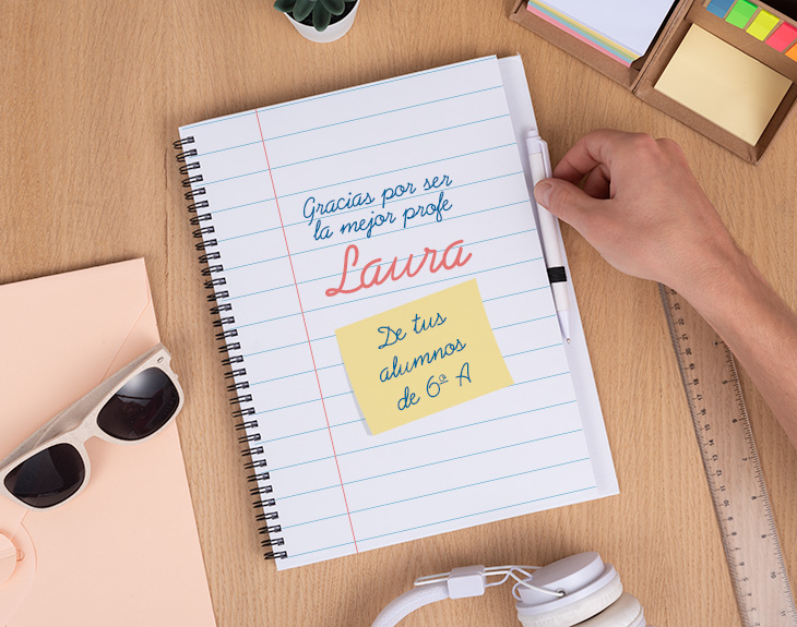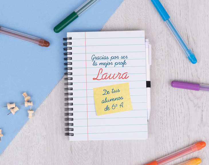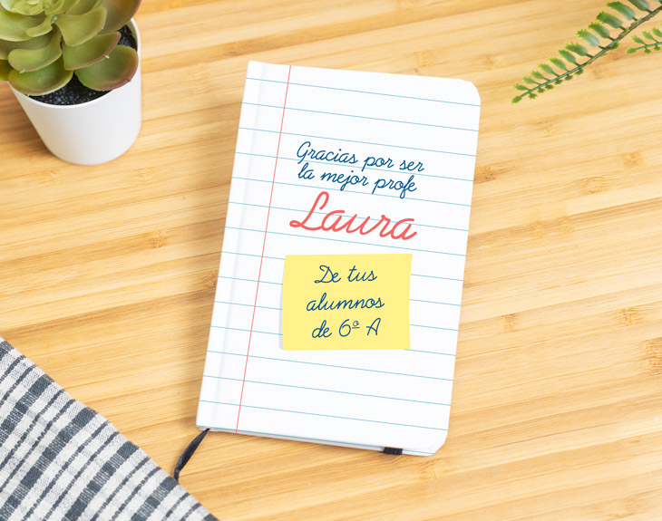 Ha llegado el mejor momento para los niños: ¡fin de curso! Cambiamos las aulas por la playa y la piscina y decimos adiós, por unos meses, a nuestros compañeros y profesores. Si habéis terminado el curso con un notas excelentes, es gracias a vuestro esfuerzo y al trabajo que ha hecho vuestro profe durante todo el año. Por toda la paciencia y dedicación que ha puesto en cada clase, seguro que os apetece sorprenderle con algún detallito. Este cuaderno personalizado es el regalo perfecto para cualquier profe, le encantará tener su propio cuaderno para apuntar sus cosas y además con un diseño muy especial. ¡Le encantará! Hay profes que necesitan apuntar todo en un papel para no olvidarse de las cosas importantes. Por eso, este original cuaderno será su mejor aliado todos los días. Dependiendo de los gustos de vuestro profe, podrás elegir qué tipo de cuaderno quieres: nuestro práctico bloc de notas, el cuaderno ecológico, el cuaderno grande con tapa dura o el cuaderno pequeño. Cualquiera de ellos le servirá para utilizarlo donde quiera y en cualquier momento. ¡Hay para todos los gustos! Tendrás que personalizar este cuaderno para que sea el más guay que tenga tu profe. Elige qué tipo quieres, añade el producto al carrito y entra en el área de personalización. Solo tienes que completar esta página con el texto que quieras y colocarlo a tu gusto para que quede perfecto. ¡Será el mejor regalo del mundo y perfecto para el último día de curso!