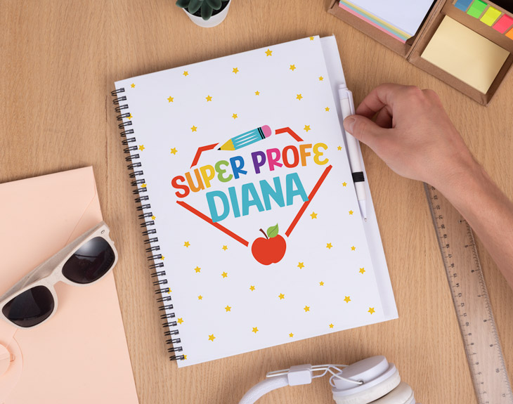 Muchas veces los profes parecen auténticos superhéroes. Y es que su verdadero poder es enseñar a sus alumnos todos sus conocimientos e intentar que entiendan y disfruten de su asignatura. Seguro que tu profe este año ha sido un súper profe en todos los aspectos y por eso se merece un regalo único: ¡nuestro cuaderno personalizado! Su diseño le hará recordar lo guay que es ser profe. Así, cada vez que necesite apuntar alguna cosa podrá utilizar este bonito cuaderno hecho por sus alumnos. ¡Le encnatará! Los profes necesitan tener siempre a mano algo que les permita apuntar muchas cosas relacionadas con su asignatura o sus alumnos. Por eso, no hay mejor manera de hacerlo que en este original cuaderno hecho especialmente para tu profe favorito. Un diseño único y lleno de colores que le encantará ver todos los días. Pero lo mejor, es que podrás elegir qué tipo de cuaderno quieres: bloc de notas, cuaderno ecológico, pequeño o grande con tapa dura. ¡Tenemos para todos los gustos! Pero para hacer de este regalo algo muy especial, tendrás que personalizar este cuaderno para profes. Elige el tipo de cuaderno, añade el producto al carrito y entra en el área de personalización. Nosotros te dejamos el diseño para que tú lo completes con el nombre que quieras. Así, tu súper profe tendrá el súper regalo que se merece el último día de curso.