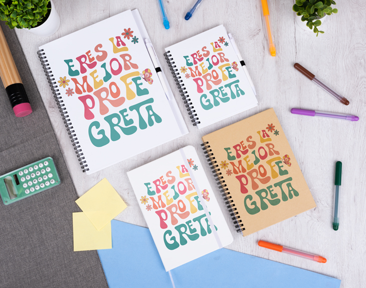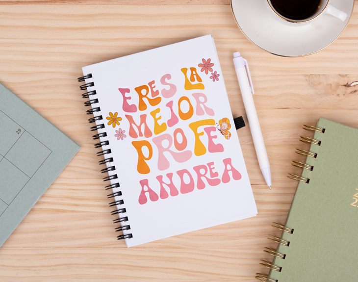 Fin de curso es el mejor momento para sorprender a ese profesor o profesora que tanto ha enseñado a tus hijos este año. Por eso, si hay algo que seguro que le hace mucha ilusión y que además será muy útil para su trabajo, es un cuaderno personalizado tan guay como este. Su diseño retro es lo que hace que este accesorio sea tan especial, además de lo colorido y divertido que es. ¡Le encantará! Aprovechando que las clases llegan a su fin, es el momento perfecto para triunfar con este original regalo. Y lo mejor es que podrá ser para cualquier profe, maestra o incluso entrenador. También, recuerda que podrás elegir el modelo de cuaderno que más te guste o el que más le sirva en su día a día: bloc de notas, cuaderno ecológico, cuaderno pequeño o grande de tapa dura. ¡Todos son ideales! No te olvides de completar el último paso que es personalizar este cuaderno para que sea el más especial del mundo. Añádelo al carrito y entra en el área de personalización. Después, añade el nombre de tu profe, colócalo a tu gusto y listo para regalar. ¡Todos los profes se merecen un detalle tan chulo!
