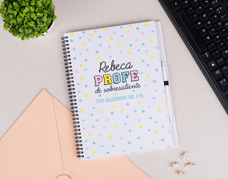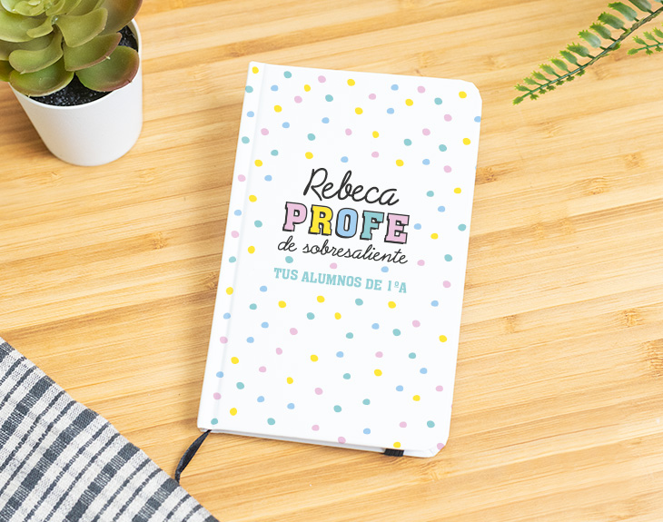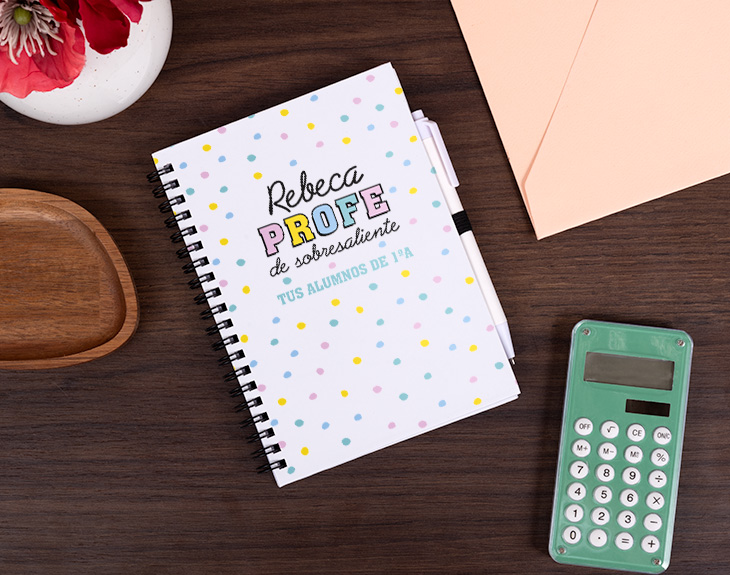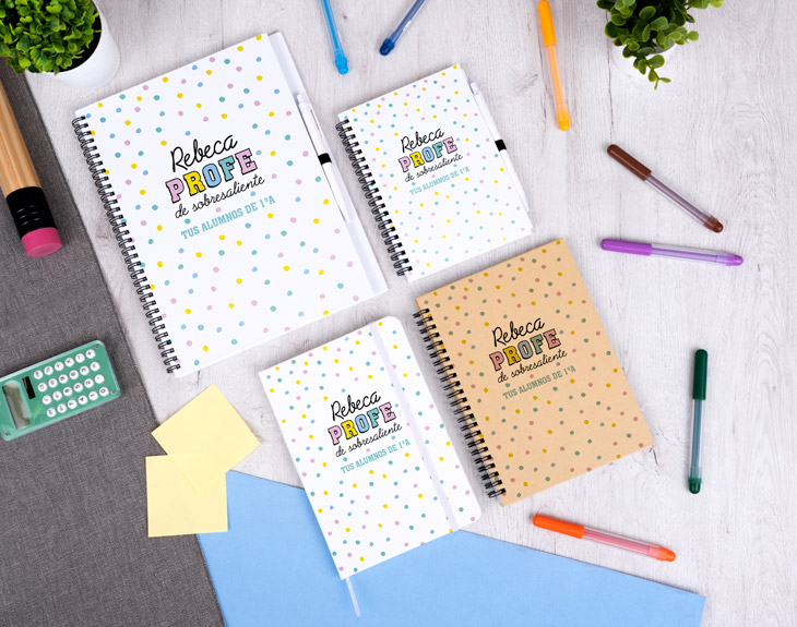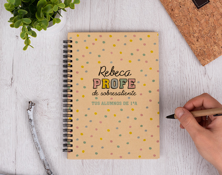 Ahora que el curso se ha acabado, es el momento perfecto para puntuar a tu profe. ¿Qué nota crees que se merece? ¿Un aprobado? ¿Un notable alto? Si lo ha dado todo este curso y ha conseguido que su asignatura sea tu favorita, se merece un sobresaliente en todos los aspectos. Por eso, una buena manera de decirle que es un profe de 10 es con este cuaderno personalizado. Porque ser un profe sobresaliente tiene premio y seguro que este regalo le encantará. ¡Será perfecto para el próximo curso! Si a tu profe le encanta escribir todo en papel para que no le olvide nada de nada, no hay mejor regalo que este original cuaderno. Es la mejor forma de agradecerle a tu profe todo el esfuerzo que ha hecho durante este curso, las cosas que os ha enseñado y la paciencia que ha tenido con sus alumnos. Dependiendo de los gustos de tu profe, podrás elegir qué tipo de cuaderno quieres: bloc de notas, cuaderno ecológico, cuaderno pequeño o cuaderno grande con tapa dura. ¡Elige la mejor opción! Pero no solo tendrás que elegir el tamaño, también tendrás que personalizar este cuaderno para tu profe favorito. Elige qué cuaderno te gusta más, añade el producto al carrito y entra en el área de personalización. Podrás elegir si quieres el diseño en colores pastel o colores más vivos y después completar los espacios vacíos con el texto que quieras. ¡Así de fácil es tener el mejor regalo del mundo para profes!