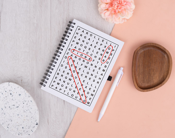 Regala (o regálate) un cuaderno personalizado con la portada customizada como si fuera una sopa de letras. Dinos unas pocas palabras (por ejemplo, dos nombres) y crearemos un cuaderno único. Disponible en cinco modelos:
