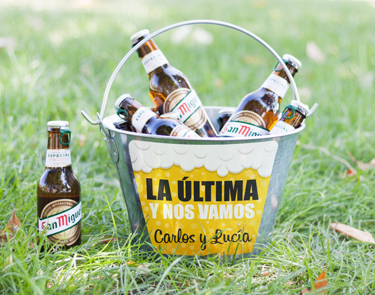 • Cubo de cerveza con abrebotellas incorporado. • Seis botellines de cerveza personalizados o sin personalizar (250 ml). (opcional) • Tarjeta Recordatoria. IMPORTANTE: prohibida la venta de bebidas alcohólicas a menores de 18 años.