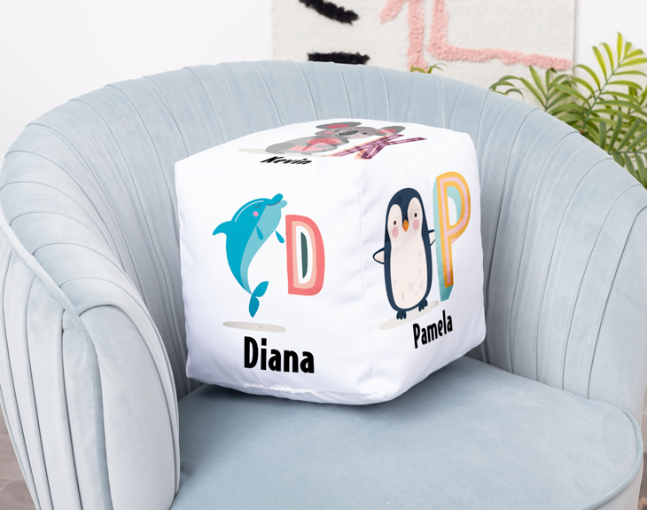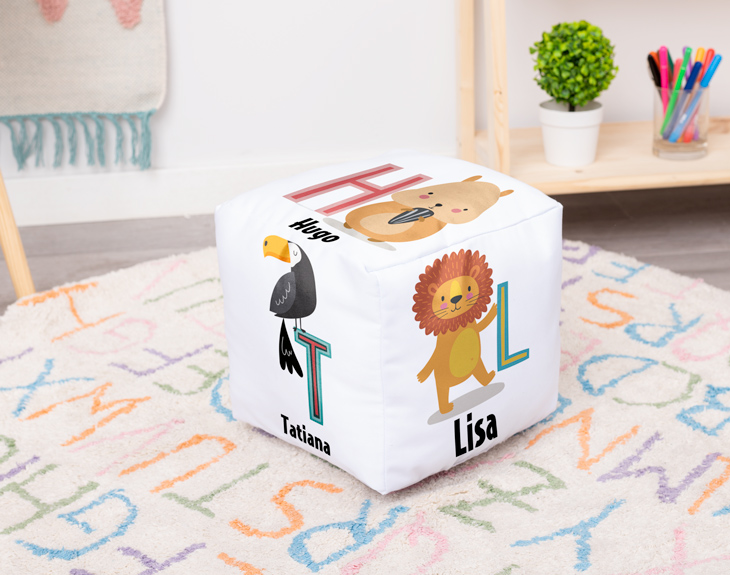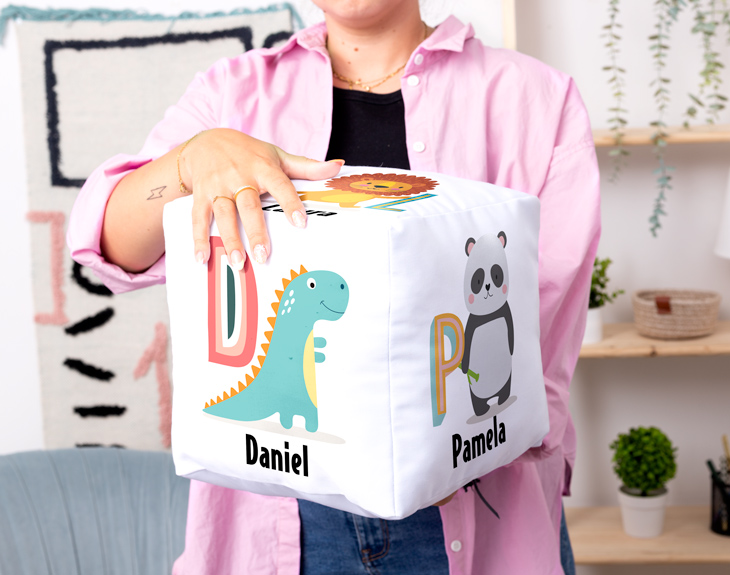 ¡El regalo perfecto para los peques de la casa! Si estás buscando un detalle muy especial para decorar su habitación, este cojín cubo personalizado con nuestra adorable familia "Alfabeto animales" es la solución. Solamente tienes que escoger vuestras iniciales, que irán acompañadas de su animal correspondiente, y escribir vuestros nombres. ¡Un detalle muy personal y único! Este dado gigante personalizado es ideal para darle un toque muy alegre al cuarto de los más pequeños (y no tan pequeños). Y es que, si conoces a alguien que le apasiona los animales, este regalo original le encantará. Detalles como estos son los que dan calidez a una casa y la convierten en un hogar, así que no pienses más y regala este monísimo cojín. Ya sea como regalo de cumpleaños, de aniversario o en cualquier otra ocasión, sorprender con un detalle tan especial como este es siempre una buena idea. Además de ser super acolchado y perfecto para abrazarlo, también podéis usarlo como dado, por ejemplo, para ver a quién le toca cocinar ese día. ¿No te parece una idea divertidísima? Especificaciones: - El cubo cuenta con 6 caras. - Cada cara incluirá un personaje - Medidas: 25 x 25cm.