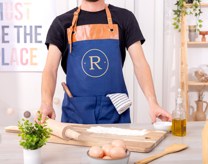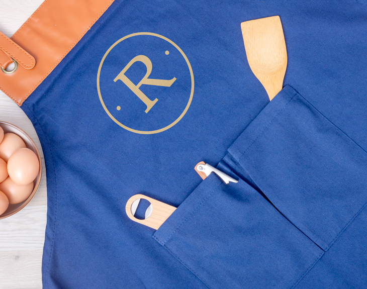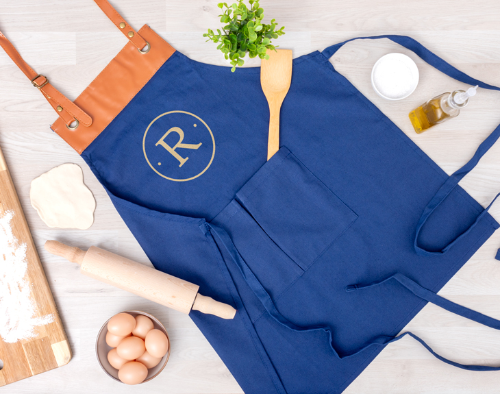 • Delantal de cocina azul personalizado. • Tarjeta Recordatoria.