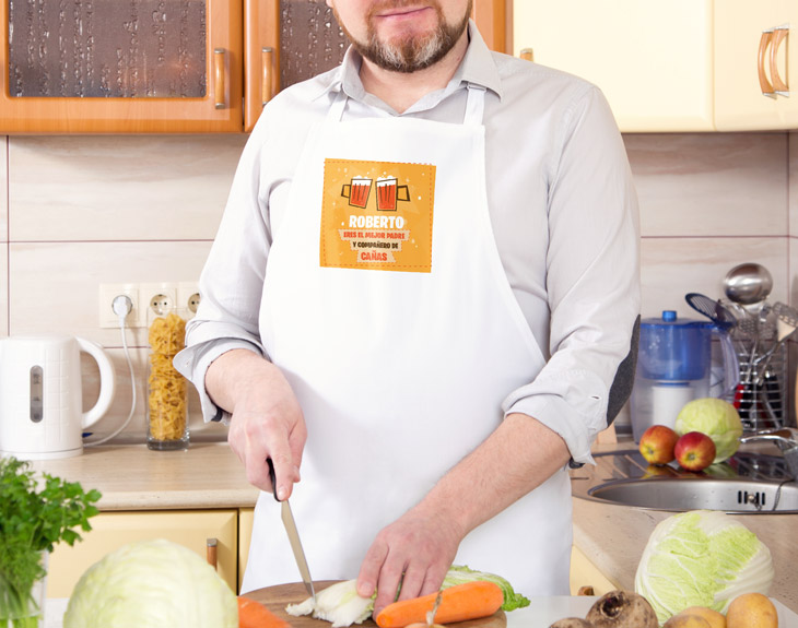 Con todo lo que tu padre ha tratado de significar para ti, ¿alguna vez se lo has agradecido de una manera bonita y original? Además de ser tu cuidador, también puede ser tu chef particular y hasta tu compañeros. Si tienes un papá tan enrollado, seguro que no podrá parar de reír cuando le regales su delantal de cocina personalizado. A partir de ahora, esos momentos juntos en la cocina serán más especiales y divertidos. Además de ser un complemento de cocina útil, también será un fantástico regalo original para padres cocineros. Y si no le gusta mucho meterse en la cocina, ¡qué mejor manera de animarle que con su propio diseño personalizado! Escribe su nombre junto a estas jarras de cervezas y dile que es el mejor padre y compinche de cervezas. Sea como sea, se podrá ajustar este delantal blanco con diseño en color gracias a su talla única y sus anchas medidas. ¡A protegerse de las manchas y a reírse! -Medidas aproximadas Delantal de colores: 89x65 cm Delantal blanco: 84x57 cm -Medidas aproximadas de la cinta del delantal con foto blanco: 60 cm cada tira. Material: 100% poliéster.