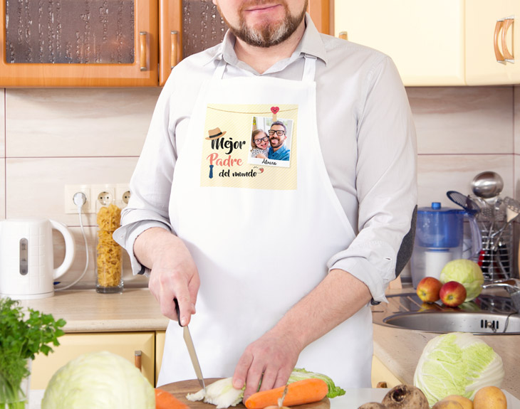 Seguro que una de las razones por las que quieres mucho a tu padre es por todos esos ricos platos que te ha hecho. ¡Cuántas comidas amenizadas con sus recetas estrella! Demuéstrale lo agradecido que estás con este delantal de cocina personalizado. Con él, no solo presumirá de ser el mejor cocinero del mundo, sino también el mejor papá del mundo. Tú has disfrutado de todos sus platos, pero él lo que más disfruta es tu compañía. Haz que siempre que se ponga manos a la obra esté contigo y añade vuestra mejor foto sobre el diseño del delantal. ¡Así será un gran regalo original para padres cocineros! Además de ajustar la foto, podrás añadir el texto y stickers que quieras sobre ese recuadro tan bonito de la foto polaroid. A partir de ahora, tu padre no podrá cocinar sin su delantal blanco con foto. ¡Totalmente a su medida con vuestra imagen y las tiras flexibles para ajustárselo! -Medidas aproximadas Delantal de colores: 89x65 cm Delantal blanco: 84x57 cm -Medidas aproximadas de la cinta del delantal con foto blanco: 60 cm cada tira. Material: 100% poliéster.