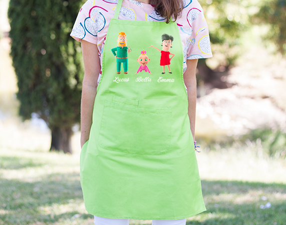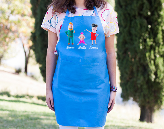 Para muchos, la familia y la cocina es una combinación perfecta. Si la tuya es una de las familias más divertidas del mundo, este es vuestro regalo original: un delantal personalizado con personajes de nuestra familia 3D. Tienes 3 colores para arrasar en la cocina. Importante: a partir de 6 personajes, se distribuirán en dos filas. Es decir: - Familia de 6 personajes: 3 en la fila superior, y 3 en la inferior. - Familia de 7 personajes: 4 en la fila superior, y 3 en la inferior. - Familia de 8 personajes: 4 en la fila superior, y 4 en la inferior -Medidas aproximadas Delantal de colores: 89x65 cm Delantal blanco: 84x57 cm Material del delantal blanco: 100% poliéster. Material del delantal de color: 65% poliéster, 35% algodón.