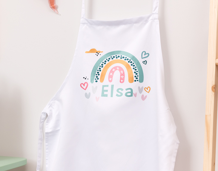 Uno de los momentos más relajantes del día es volver a casa y ponerse a cocinar la cena: es desestresante y además ayuda a que nos alimentemos de forma sana. Probar nuestros platos después de cocinarlos es uno de los mayores placeres, y más si nos ayuda una persona especial, como es nuestro hijo. Con este delantal infantil personalizado sorprenderás a tu pequeño ayudante de cocina. Un delantal de cocina es una de las herramientas más útiles y que menos tenemos por casa: nos salva la ropa de manchurrones que no se pueden lavar y olores que se pegan fácilmente, cuando es para nuestros hijos es aún más importante ya que se manchan con más facilidad. Seguro que este diseño de arcoiris pastel le encanta al peque de la casa: podrás personalizarlo con su nombre y le hará todavía más ilusión. Es un regalo original que podréis usar mientras estéis juntos y hará que esos momentos que pasa contigo sean aún más especiales. Medidas: 51x70 cm