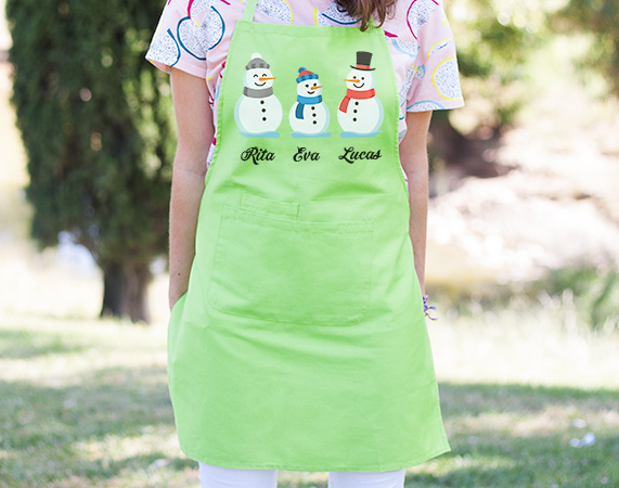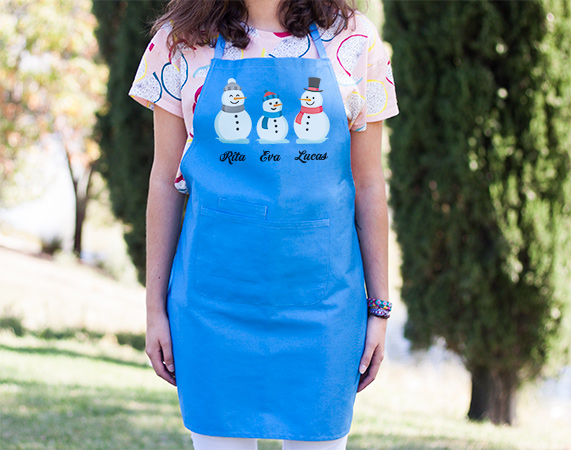 Con nuestro delantal personalizado podrás darle un toque navideño a tu cocina. Si las reuniones familiares en Navidad se basan en comidas hechas en casa con todo el amor y el cariño, este delantal es el regalo perfecto. Elige diferentes muñecos, ponle los nombres de los miembros de la familia y disfruta de la época más adorable del año. Importante: a partir de 6 personajes irán distribuidos en dos filas. Es decir: - Familia de 6 personajes: 3 en la fila superior, y 3 en la inferior. - Familia de 7 personajes: 4 en la fila superior, y 3 en la inferior. - Familia de 8 personajes: 4 en la fila superior, y 4 en la inferior. -Medidas aproximadas Delantal de colores: 89x65 cm Delantal blanco: 84x57 cm Material del delantal blanco: 100% poliéster. Material del delantal de color: 65% poliéster, 35% algodón.