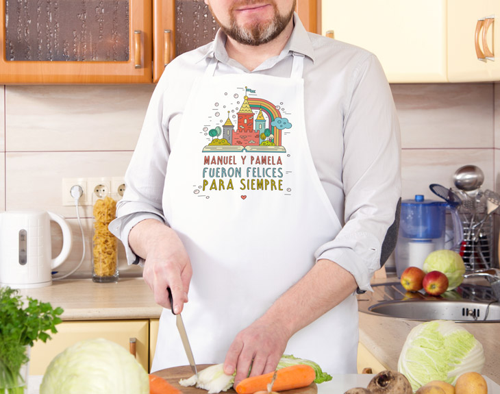 Cuando la relación con tu pareja pensabas que no podía ir a mejor, llega un regalo original y te descuadra el esquema. ¿Vives un amor de cuento? Sales a pasear con tu pareja y te parece el mejor plan del mundo, te hace la cena y siempre es muy romántica o está pendiente de ti a todas horas. Está claro que vives un amor de cuento. Por eso, este delantal personalizado está diseñado para ti, para que puedas seguir haciendo grande ese amor que tanto os une. Cocinar juntos es lo que os falta, y este delantal os dará la oportunidad de oro para aprovechar el tiempo juntos. Solo necesitamos vuestros nombres para personalizar el regalo. A partir de ahí, esta dulce y feliz pareja serán felices para siempre, al igual que los amores de cuento. ¿Os animáis a vivir una de las mejores relaciones de amor de vuestra vida? -Medidas aproximadas Delantal de colores: 89x65cm. Delantal blanco: 84x57cm. Material del delantal blanco: 100% poliéster.
