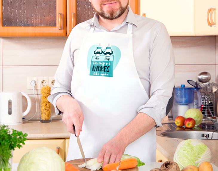 Un padre perfecto debe ser aquel que siempre está dispuesto a ayudar y criar a su hijo, independientemente de lo que tenga que costar... ¿y acaso hay mejor manera de mantener a un niño que alimentándole? La comida es muy importante para su desarrollo. Por eso creemos que los mejores padres del mundo deben ser aquellos que, además de poseer todas las cualidades de las que hemos hablado, sean unos maestros en la cocina. ¿Quieres que esos grandes papás tengan un delantal que hable de ellos y de su increíble habilidad para criaros a lo largo de vuestra vida? Este delantal personalizado es el elemento que tu padre necesita para convertirse en el mejor cocinillas de toda la casa. Si quieres que te haga todos tus platos favoritos, entonces has encontrado un regalo que le viene a la perfección. Añade los nombres que desees a este fantástico diseño. Así... ¡crearás un regalo original que será perfecto para sorprender a tu padre! Queremos que tengáis un Día del padre de lo más especial, y este detallazo hará que le saque una sonrisa al hombre más especial de tu vida. -Medidas aproximadas Delantal de colores: 89x65 cm Delantal blanco: 84x57 cm -Medidas aproximadas de la cinta del delantal con foto blanco: 60 cm cada tira. Material del delantal blanco: 100% poliéster.