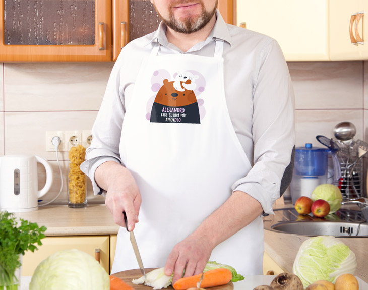¿Quién es el cocinillas de la casa? Puede que tu padre sea la persona que se dedica a cocinar a toda la familia. Esos riquísimos platos que cocina deben de estar sacados del mismísimo paraíso. Cuando se pone el delantal, sabes que te espera una sabrosa cena. ¿Quieres hacerle un regalo personal y amoroso para este Día del padre? Este delantal personalizado es un detalle de lo más cuqui y útil. Y es que puede que tu padre también sea la persona más cariñosa de la casa. ¿Cuántas veces te ha cuidado y mimado a lo largo de los años? Seguro que muchas veces se pasa de amoroso. Eso significa que te quiere más que a nada, y por eso se merece un regalazo. Podrás decirle todo lo que le adoras de una manera singular y muy, pero que muy personal. Si tu padre está todo el día dándote abrazos y besos, entonces este delantal es el regalo indicado. En este diseño, se pueden ver dos osos monísimos, cuidándose y jugando. ¿Acaso puede haber algo más adorable? Nosotros creemos que no. Podrás personalizar este regalo original, añadiendo el nombre de tu padre en el diseño. ¡Dale una sorpresa al cocinero más amoroso! -Medidas aproximadas Delantal de colores: 89x65cm. Delantal blanco: 84x57cm. -Medidas aproximadas de la cinta del delantal con foto blanco: 60 cm cada tira. Material del delantal blanco: 100% poliéster.